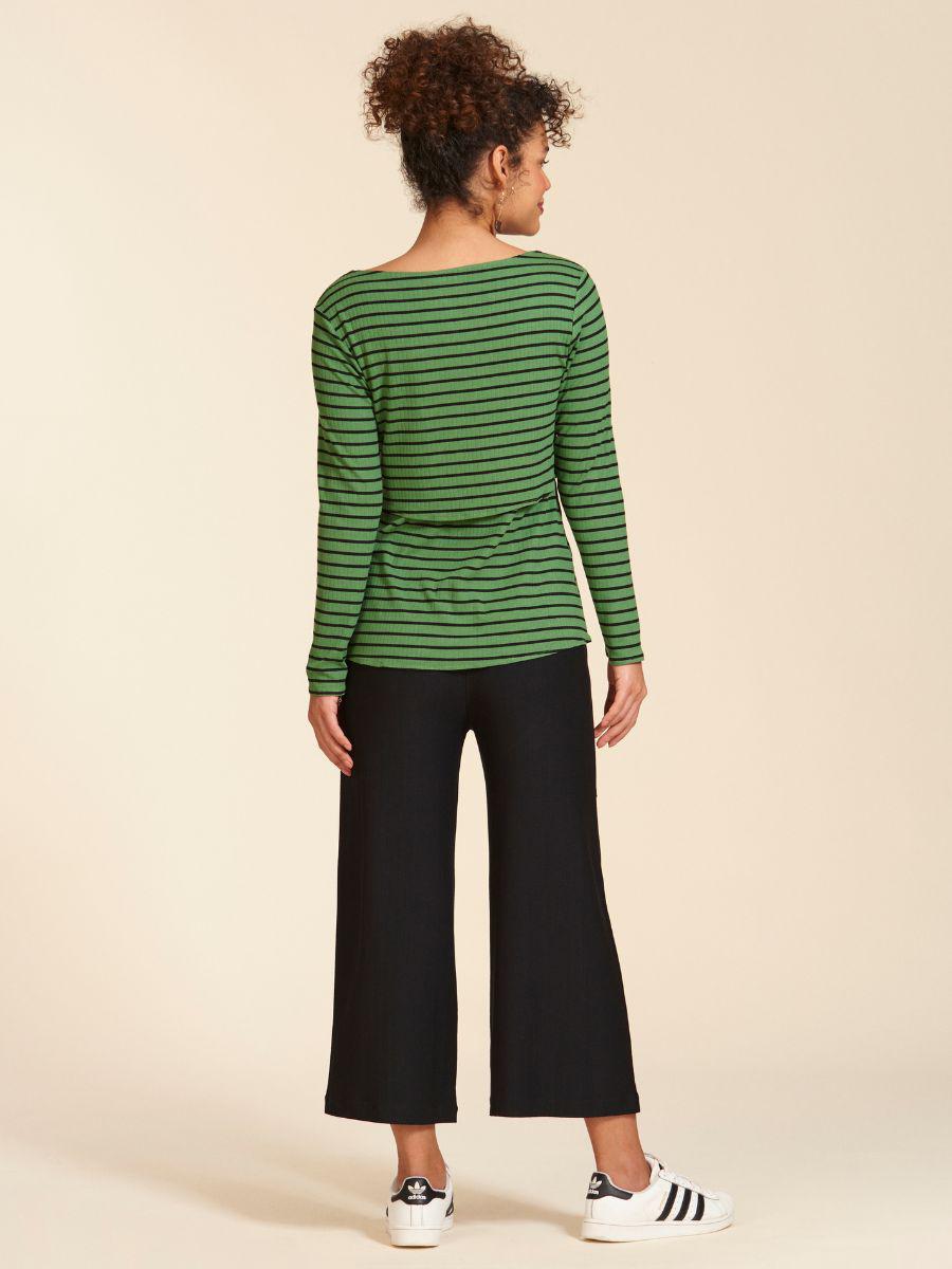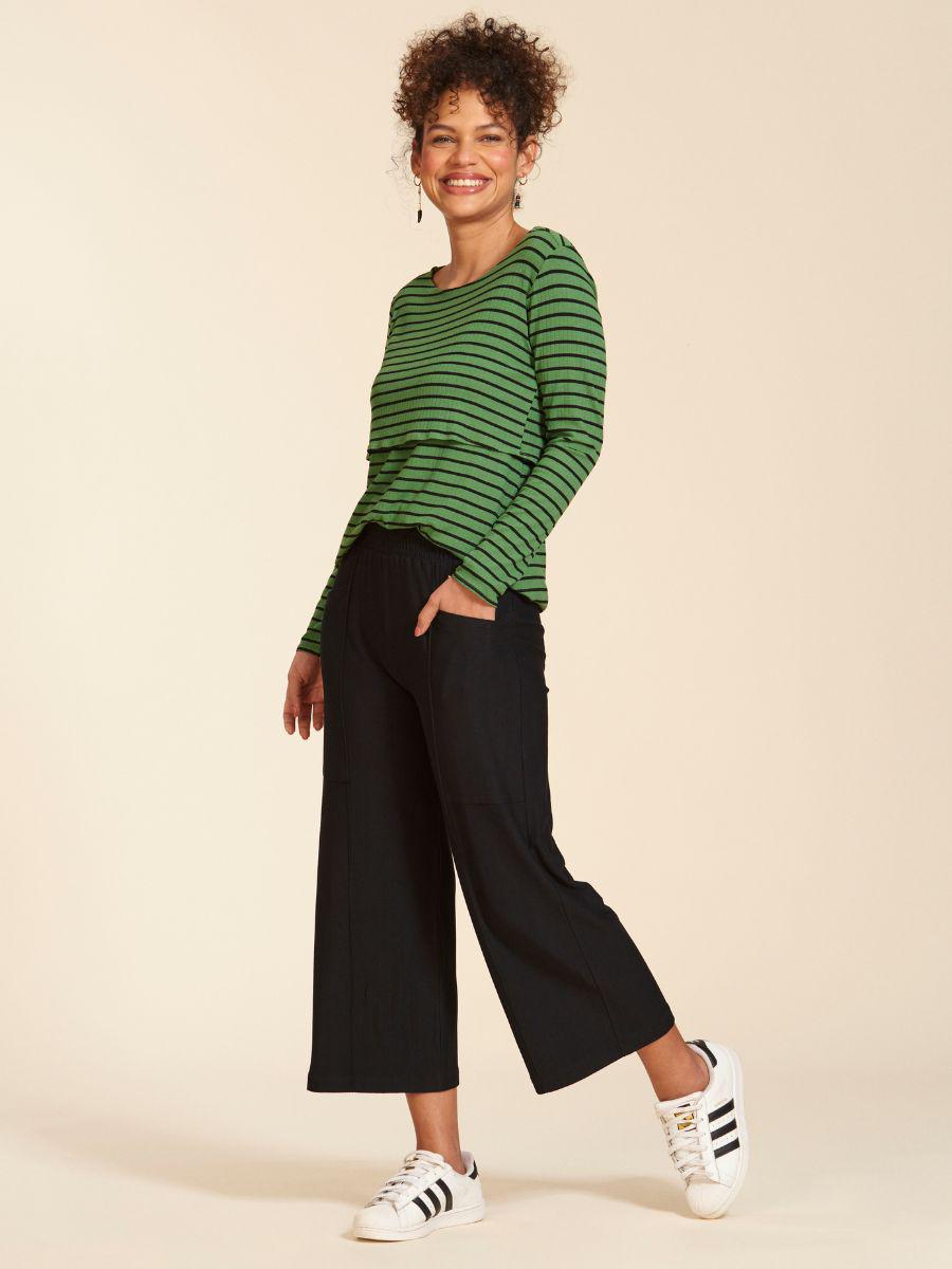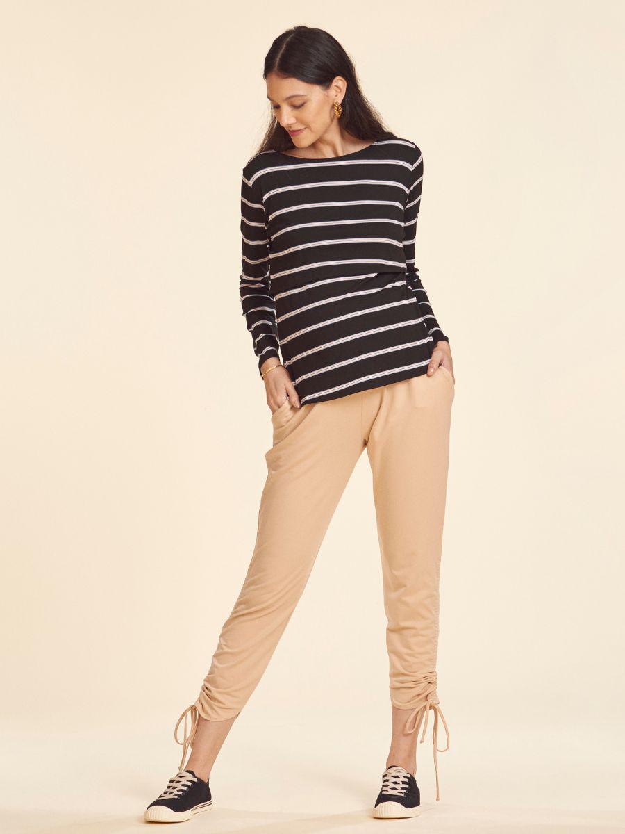 A modelo grávida, que usa a blusa up & down preta listrada veste M. Ela mede