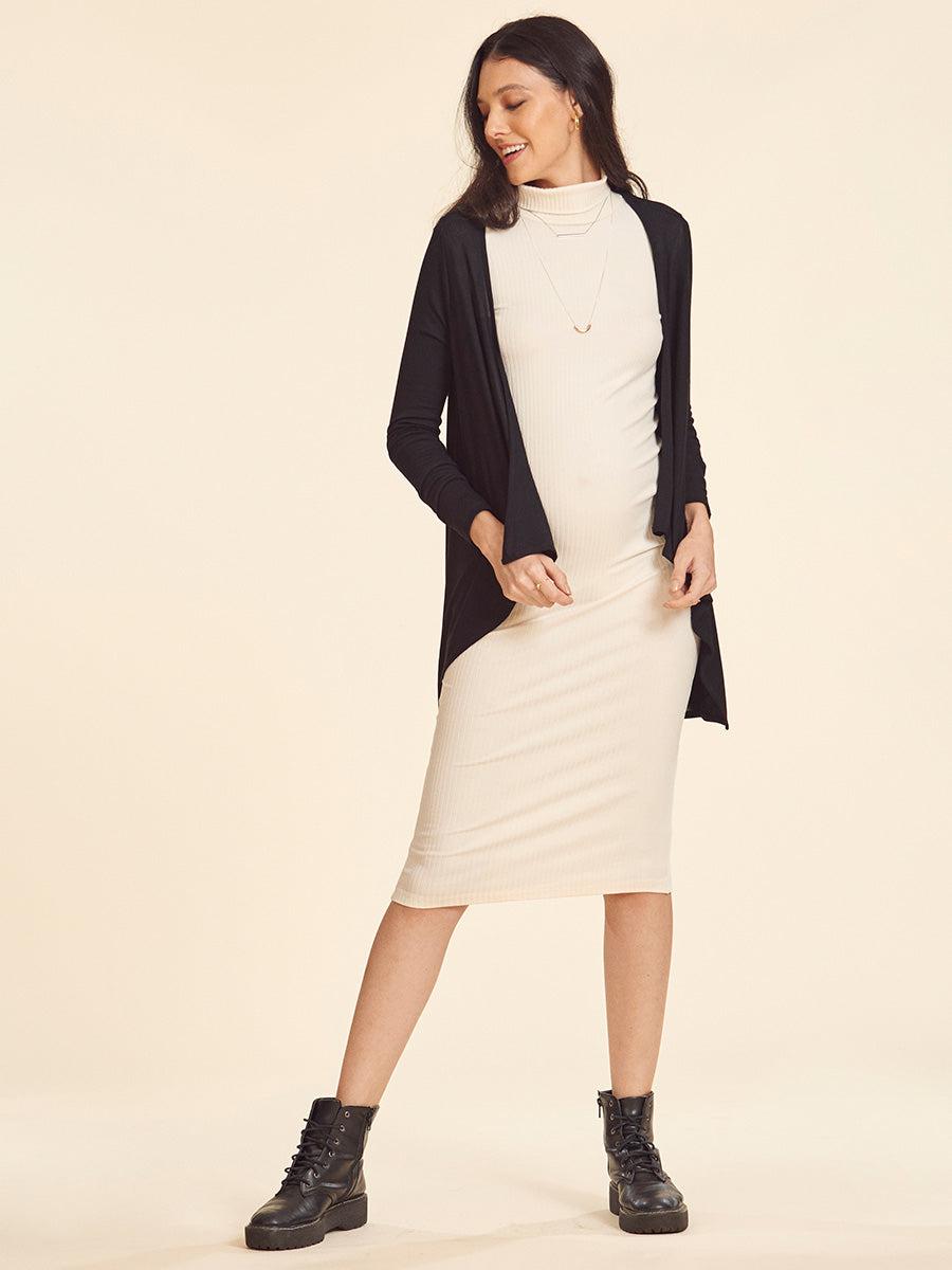 O Vestido Gestante Costine Málaga é feito em tecido canelado e tem gola alta. Sua modelagem é justinha e se ajusta ao corpo.