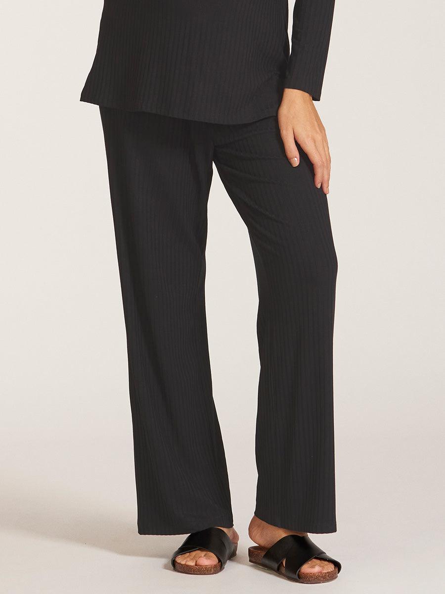 Calça em tecido canelado composto por fio de viscose que resulta em um toque especial. Essa calça possui cós em lastex, que se adapta facilmente às mudanças do corpo provocadas pela gestação. O acabamento em lastex é feito com elásticos bem fininhos, em fileiras, que esticam, sem deformar. Assim, é muito democrático porque veste bem quem está grávida ou não. Além do conforto proporcionado pelo tecido, bem como pelo cós, é uma calça básica, que permite diversas combinações. Segue o estilo “bed to street”.