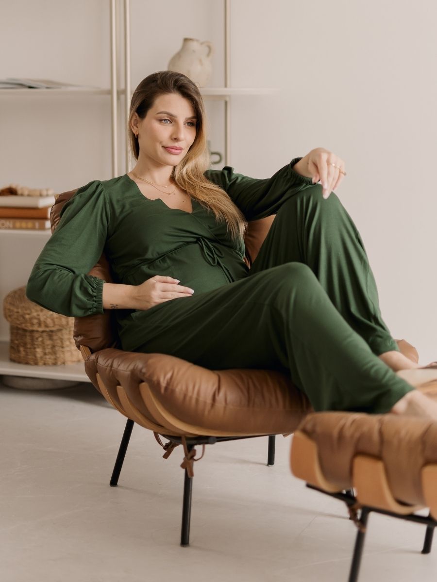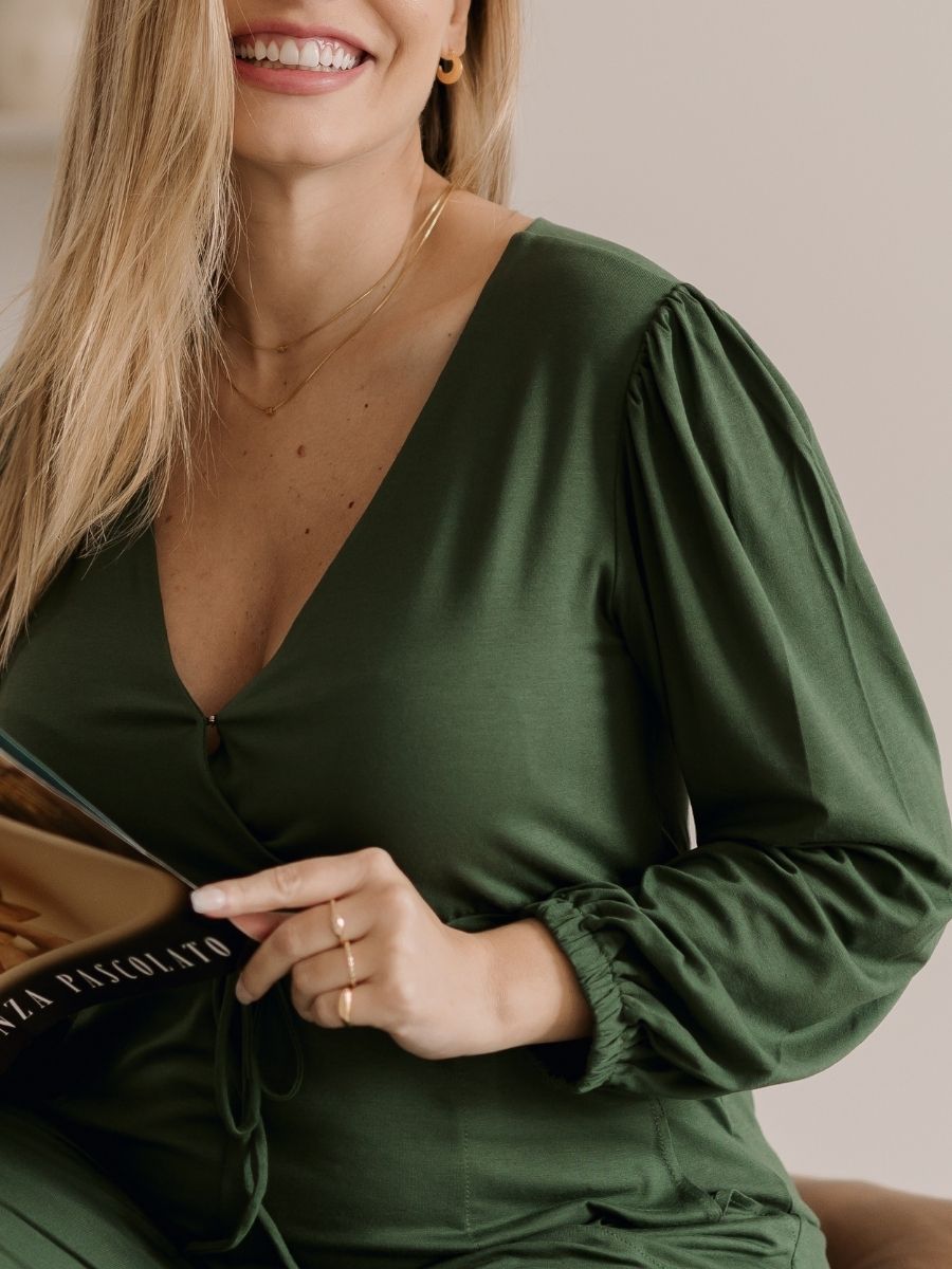 O decote transpassado facilita o acesso à amamentação com discrição, enquanto o destaque fica por conta das mangas longas com modelagem tipo “pera” — levemente bufantes e finalizadas com punho franzido. Um detalhe que valoriza os ombros, equilibra a silhueta e traz charme extra ao visual.