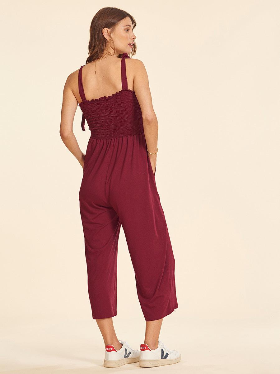A modelo vestindo o macacão bordô, mede 1, 77 m, usa manequim 36 e veste P.