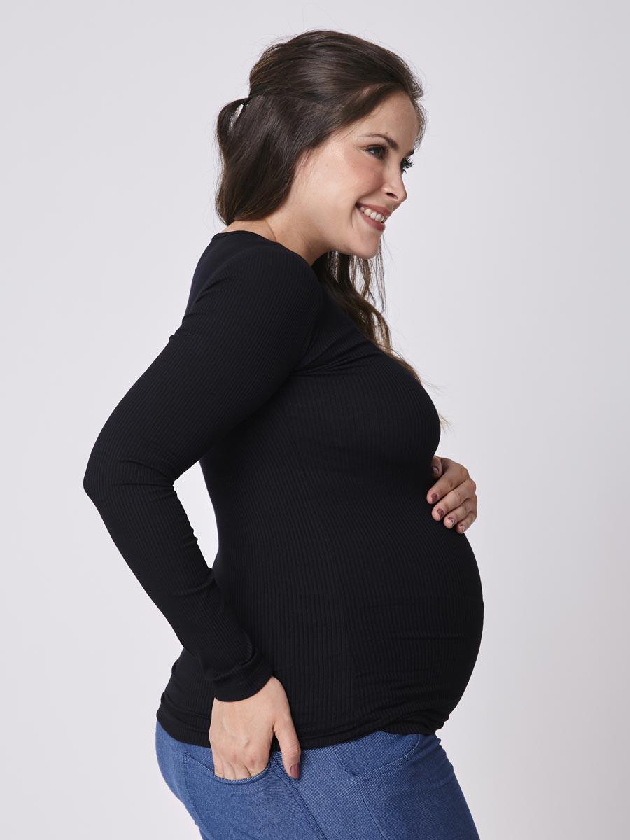 A ribana manga longa pode ser usada em qualquer fase. É uma blusa básica, que poderia compor o guarda roupa de toda mulher, com o cuidado especial para o conforto da gestante. Como tem elastano, o tecido acompanha o crescimento da barriga sem deformar, isto é, continua super útil também depois da gestação.