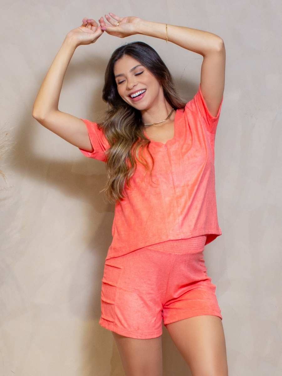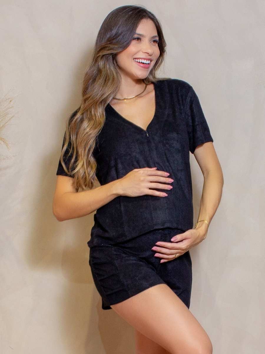 Short gestante confeccionado em tecido atoalhado, possui o cós em lastex, que acompanha o crescimento da barriga, oferecendo máximo conforto. Os bolsos na parte de trás são funcionais. Nas laterais tem um detalhe bem charmoso.