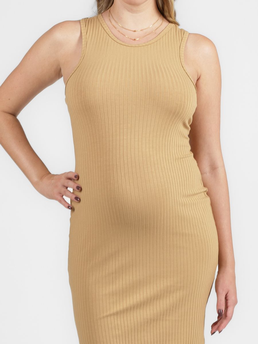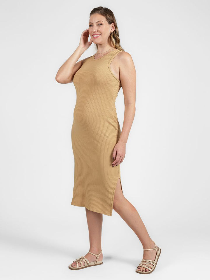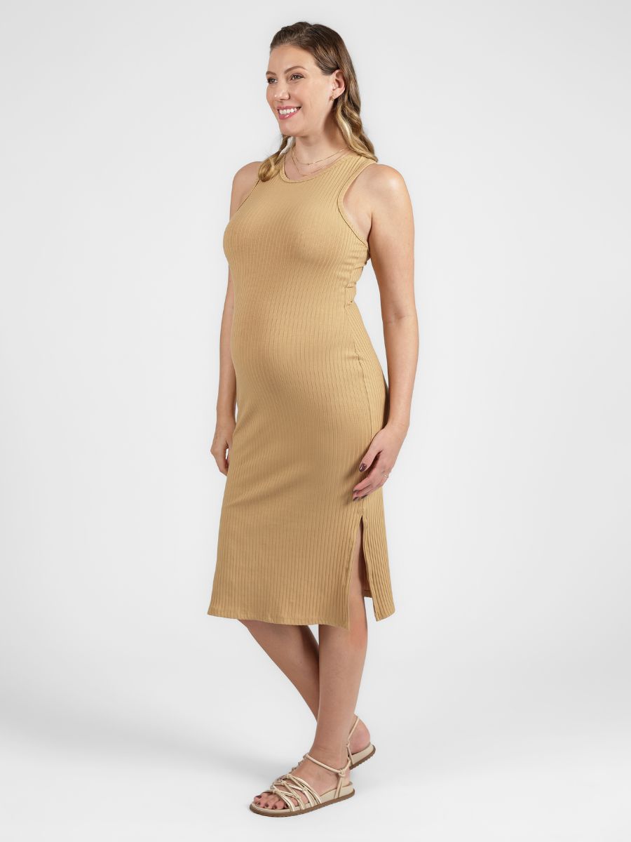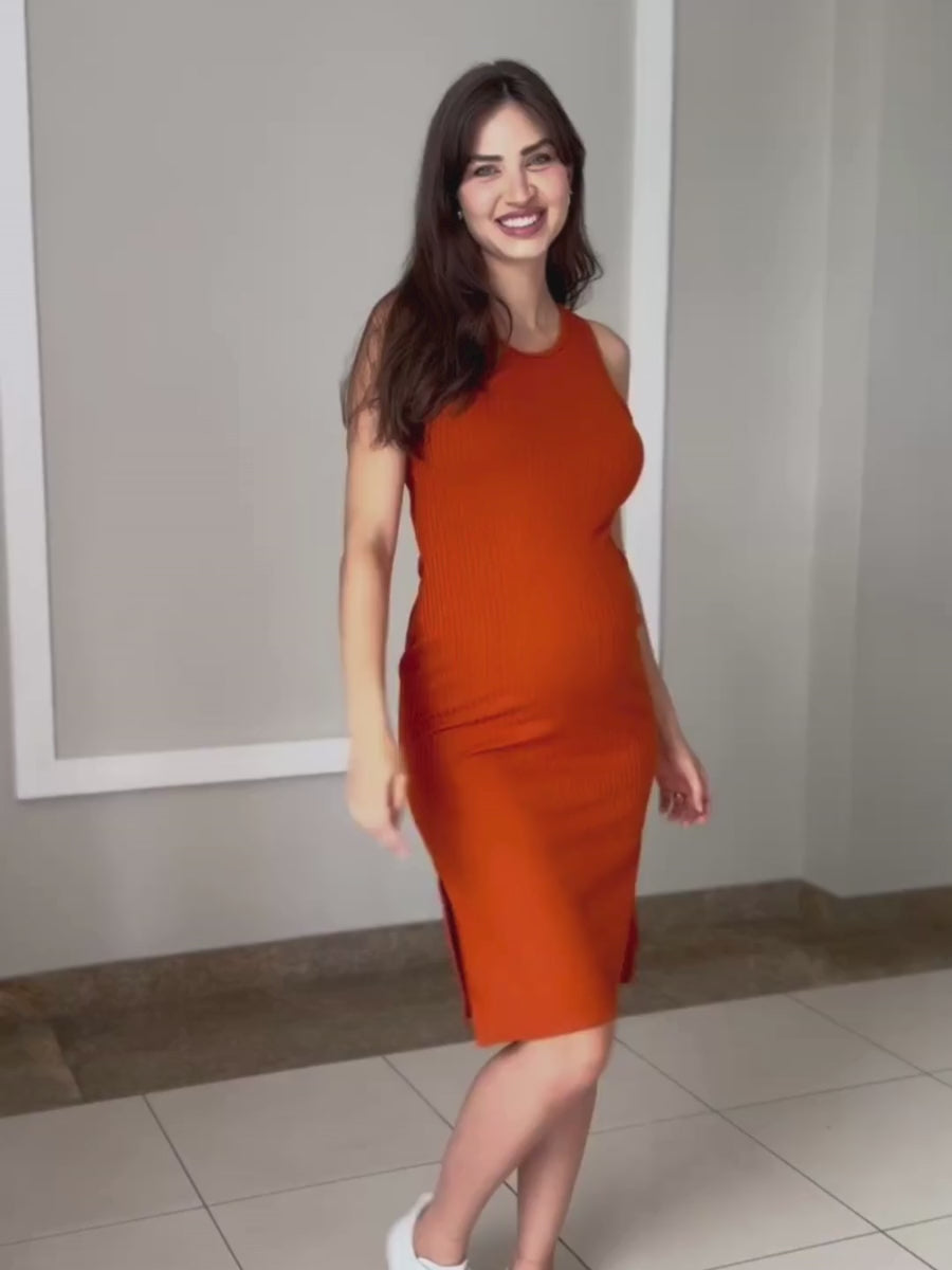 Esse vestido gestante midi é confeccionado em tecido canelado super flexível, que se ajusta ao corpo lindamente. Tem um shape moderno, fit, destacando os ombros. É uma modelagem clássica, perfeita para o verão.