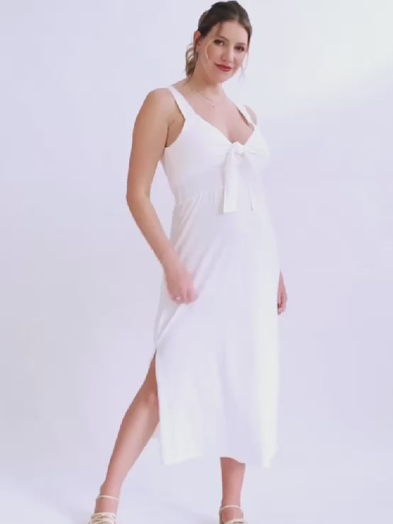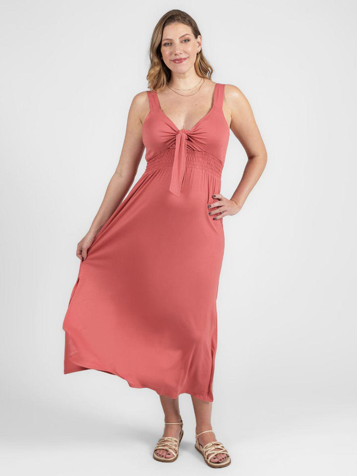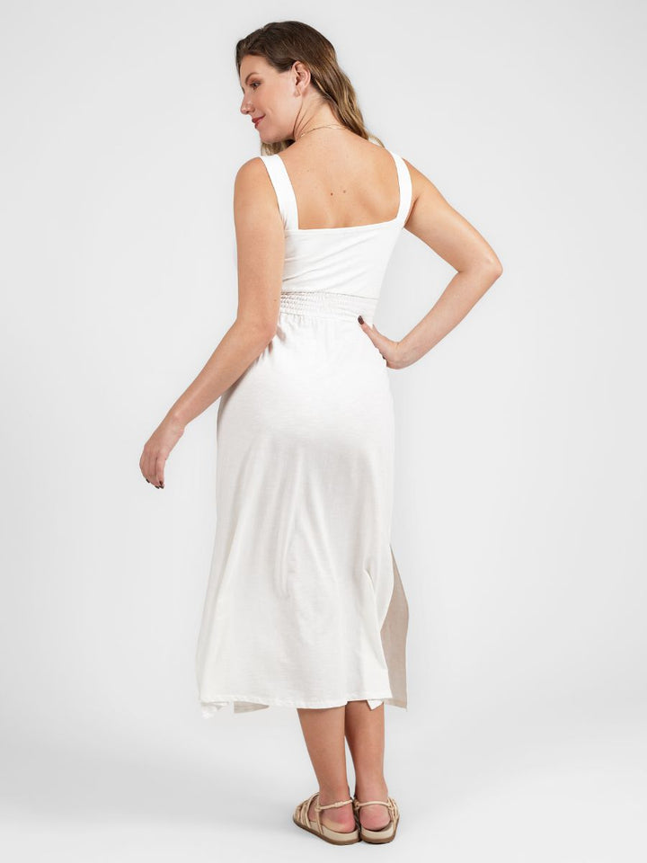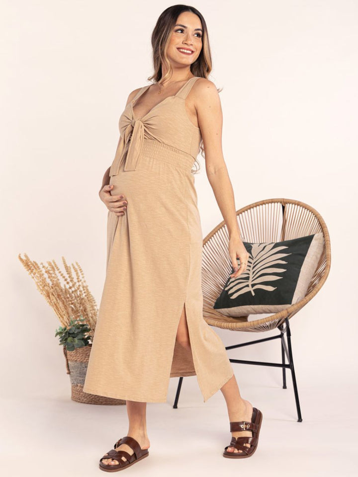 Na gestação, a faixa de lastex abaixo do busto dá flexibilidade e conforto necessários para acomodar a barriga que vai crescendo, permitindo que o vestido seja usado durante toda a gestação.