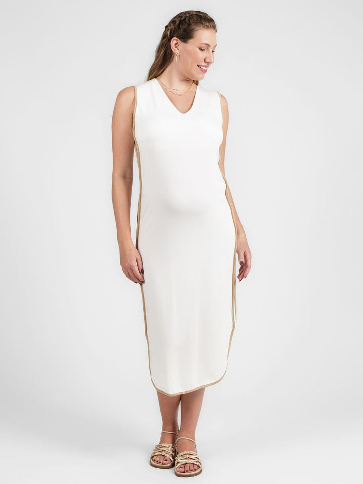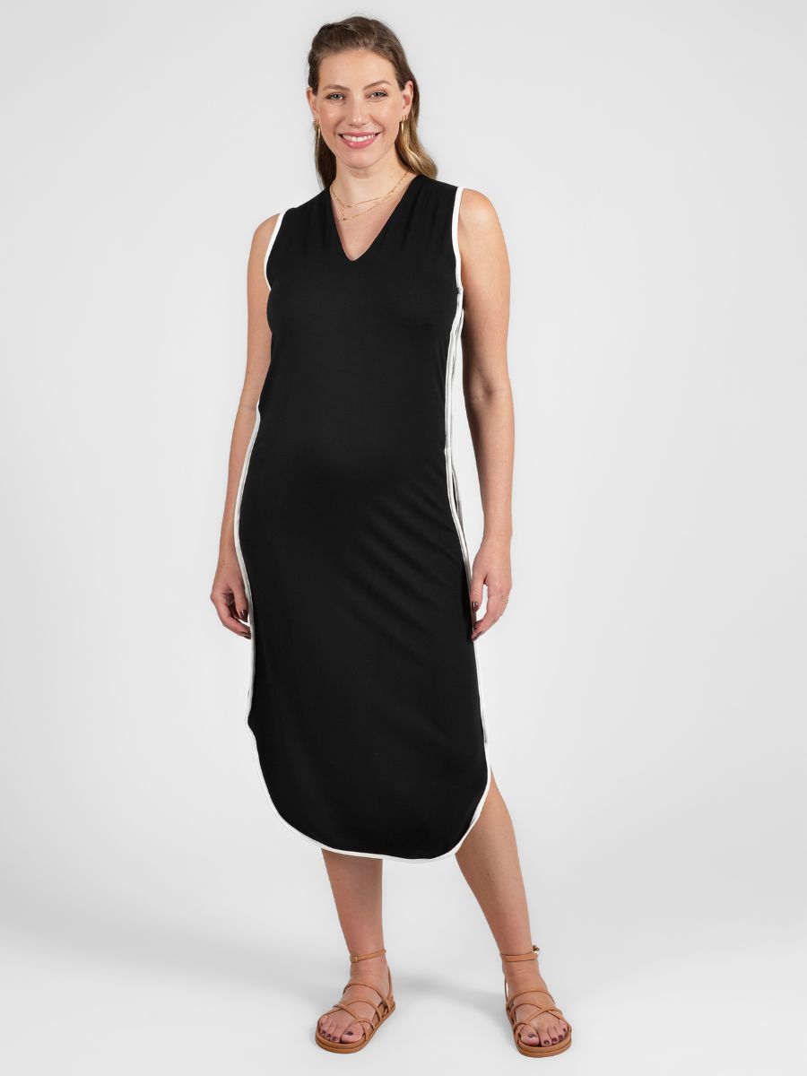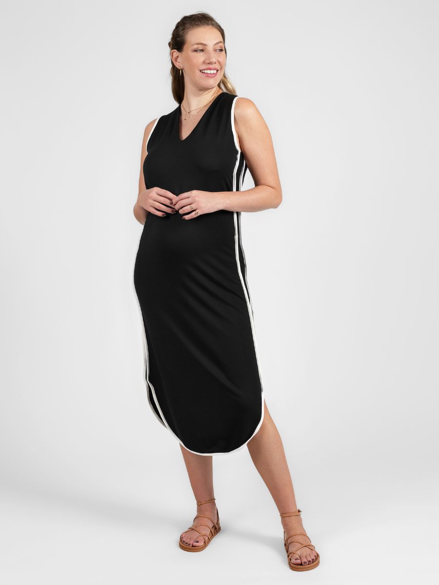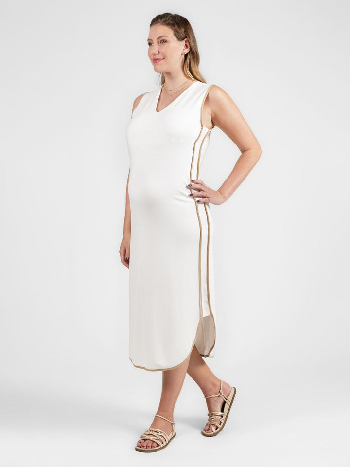 O Vestido Gestante Carol é confeccionado em moletinho bem leve, que não marca nada. Tem um shape moderno com vivo contrastante. Nas laterais, entre os vivos, possui lateral em ribana, que termina com as fendas arredondadas.