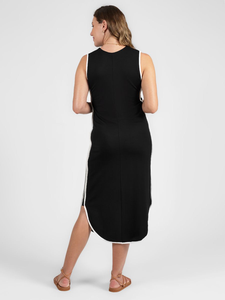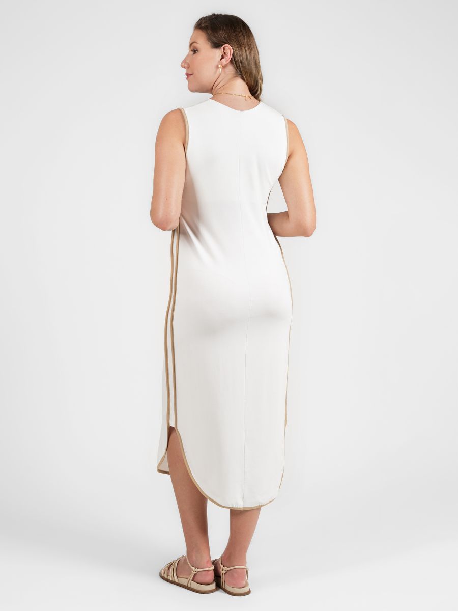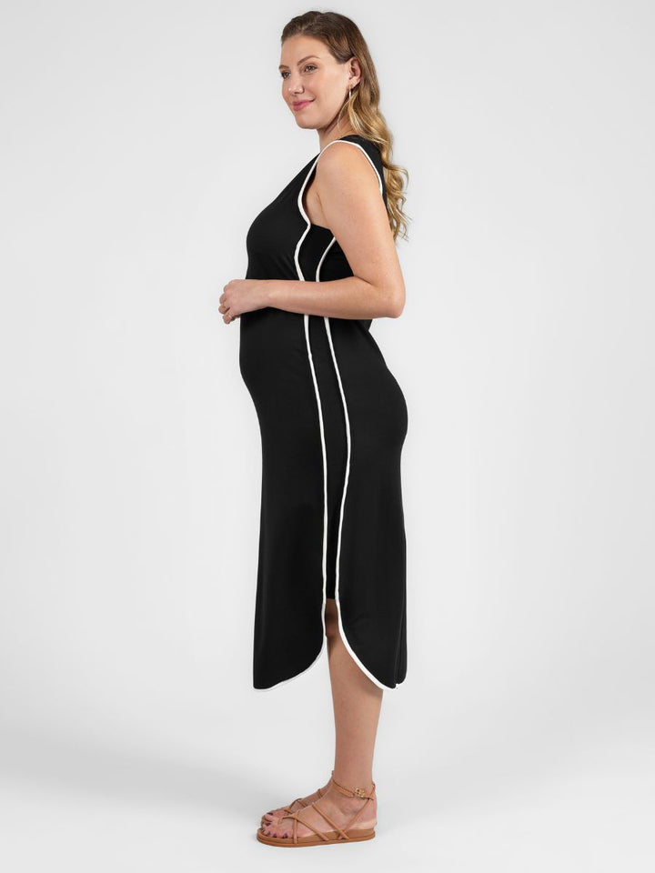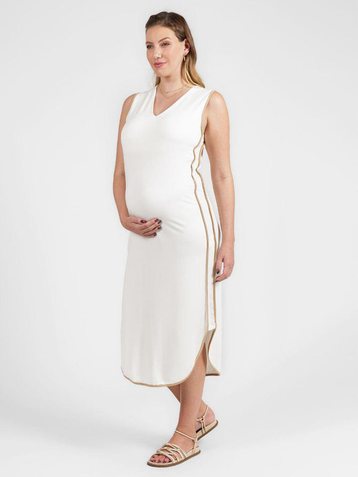 O Vestido Gestante Carol é confeccionado em moletinho bem leve, que não marca nada. Tem um shape moderno com vivo contrastante. Nas laterais, entre os vivos, possui lateral em ribana, que termina com as fendas arredondadas.